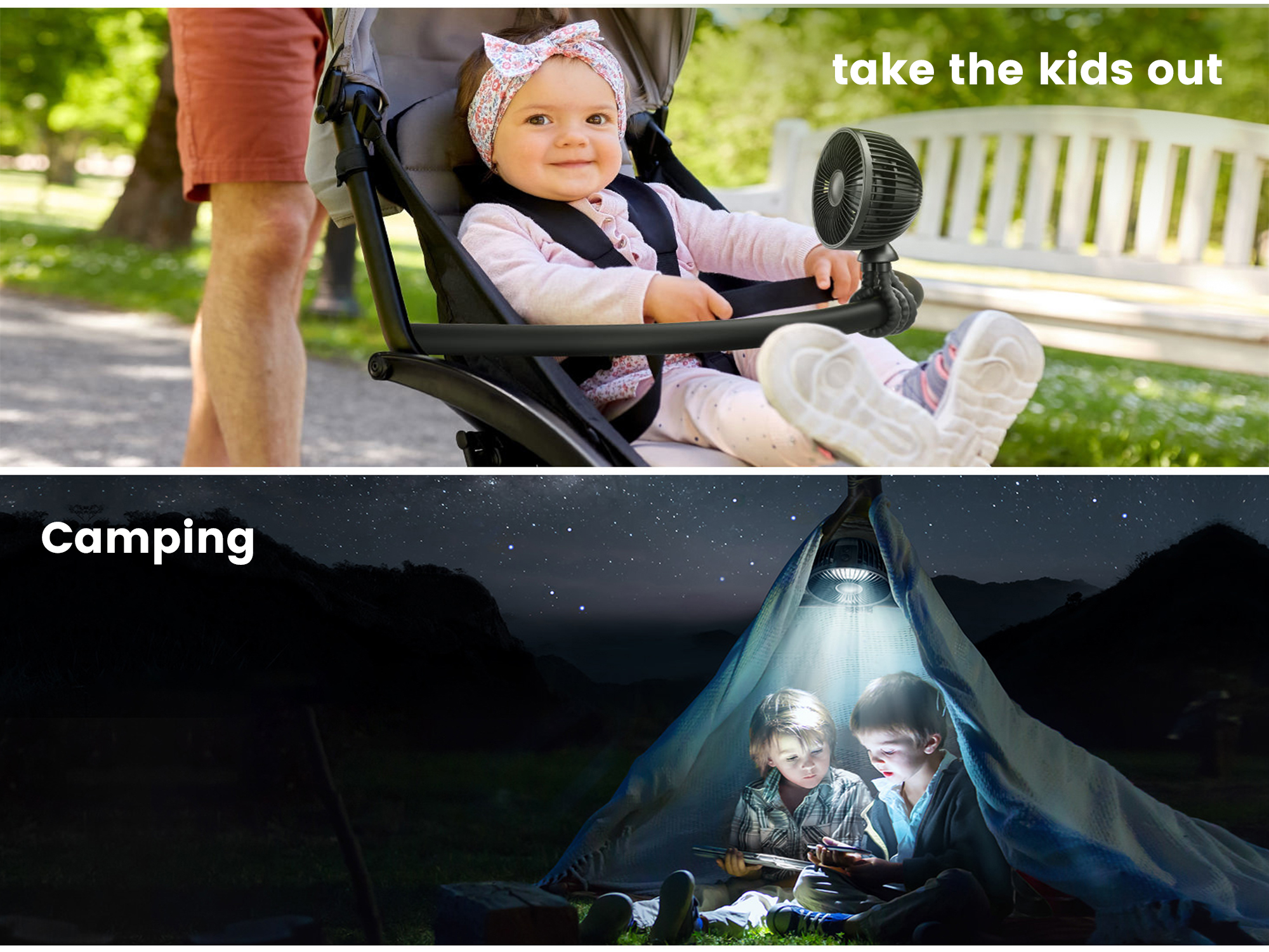 Promenades et sorties avec les enfants Lors de vos promenades avec bébé en poussette sous un soleil de plomb, le MIJIDI M10S vous offre une solution de rafraîchissement compacte et pratique. Fixez-le au châssis de la poussette à la hauteur idéale pour diriger un flux d'air doux sur l'enfant et son porteur. Grâce à sa portabilité et à son design, vous pouvez vous déplacer librement, sans avoir besoin d'un ventilateur portable, et ainsi profiter pleinement de votre sortie.